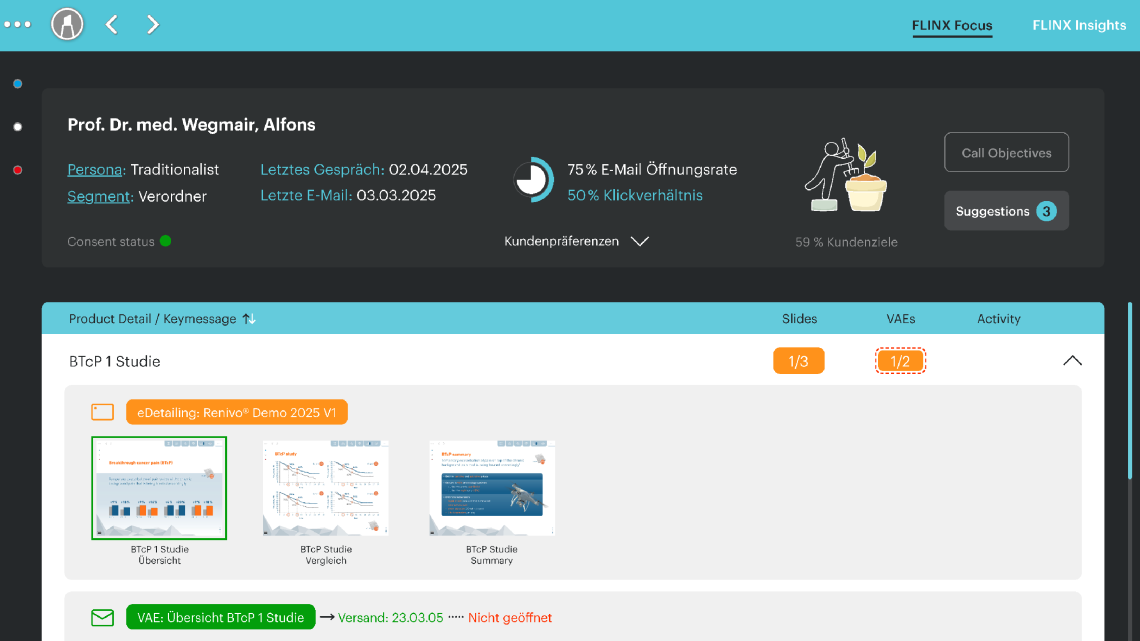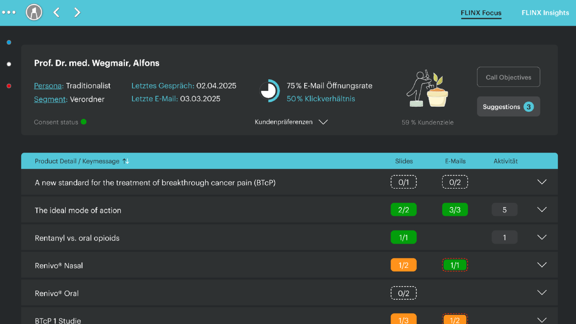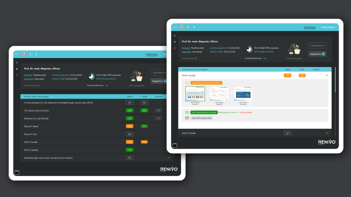 That's why we have developed FLINX Focus within our FLINX Family, a solution that perfectly complements existing reports, etc., and enables the sales force to take action directly in detail – always up-to-date, completely data-based, and yet very simple and intuitive in the Veeva app on the iPad.