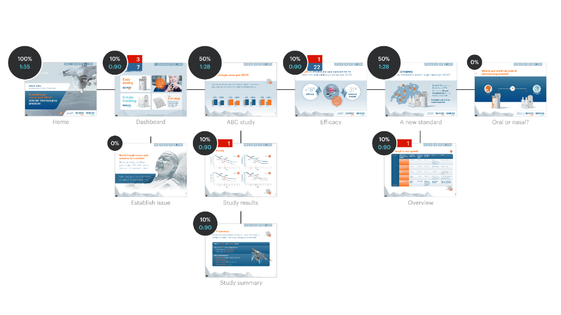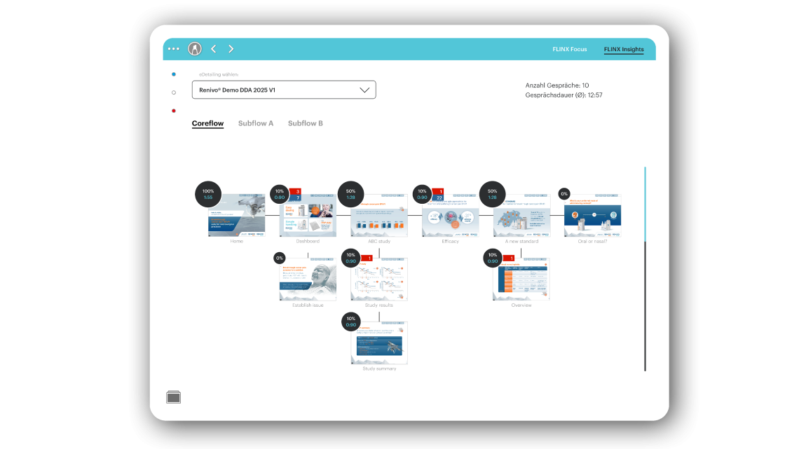 On a second slide, FLINX Insights can be used to integrate a copy of the eDetailer sitemap if desired. Specific, up-to-date facts are displayed directly on the thumbnails of the individual slides with visual support: